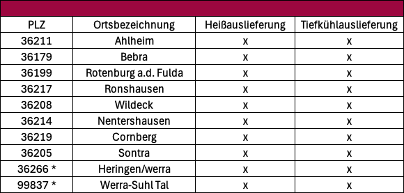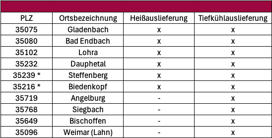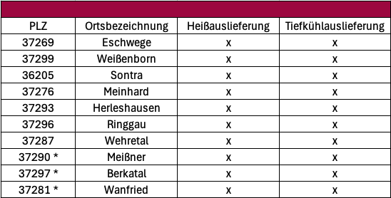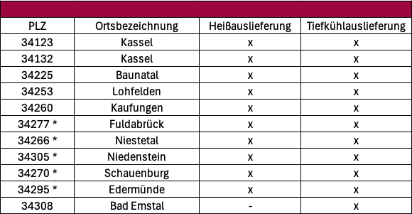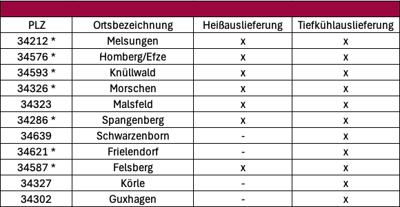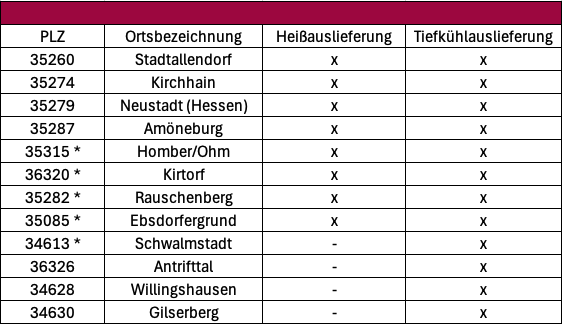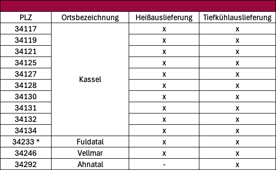 Wir beliefern täglich mit 19 Touren aus sieben Standorten zahlreiche Senioren in ganz Nordhessen. Überprüfen Sie hier, ob Ihre Postleitzahl in unserem Liefergebiet liegt. Sollte Ihre Postleitzahl nicht dabei sein, rufen Sie uns einfach unter der kostenlosen Telefonnummer 0800-3403440 an. Gemeinsam finden wir heraus, ob wir unser Liefergebiet auf Ihre Region erweitern können.